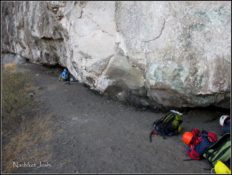 पहिले सत्तर-एक फूट सरांनी लीड क्लाईंब केलं. Now its Suraj to go next. फोटोत डावीकडून सर, संजय आणि सूरज